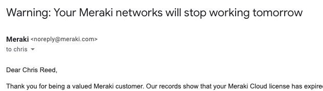Now I get to pick on Meraki, but they're just the one I've been personally burned by, others are at fault as well. Everyone has their licensing woes but few are as widespread or impactful as Meraki. For those that don't know the licensing model for Meraki is to buy the hardware upfront, then buy a subscription for it. When the subscription runs out and you don't renew it, the hardware stops forwarding traffic and you get a lovely little email telling you about it